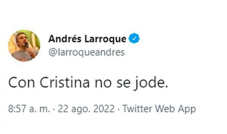 in Nacionales Advertencia de La Cámpora: “Con Cristina Kirchner no se jode” El secretario general de La Cámpora Andrés “Cuervo” Larroque envió un desafiante mensaje en Twitter: “Con Cristina Kirchner no se jode”. by Usuario 2 22 agosto, 2022, 11:46 am 1.9k Views En tanto que La Cámpora publicó en Twitter el mensaje: “El pueblo no olvida. #TodosConCristina”, con una foto de la vicepresidenta, previo al pedido de pena de la fiscalía a la titular del Senado en el juicio por la causa Vialidad. See more Previous article Obra Pública: Cristina Kirchner pidió ampliar su declaración indagatoria Next article El Gobierno gastó casi $7 mil millones en campañas de difusión: vacunas y elecciones, entre las más costosas