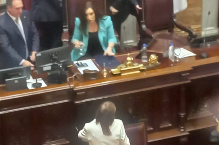 Villarruel argumentó que en la reunión de Labor Parlamentaria de ayer los jefe de bloque habían acordado no dar discursos. Levantada la sesión, Bullrich se paró y se acercó hasta el estrado de la Presidencia.