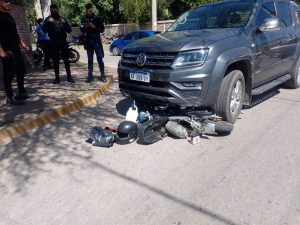 En la mañana de este viernes se produjo un fuerte choque entre una camioneta Amarok gris oscura que lo hacía circulando en sentido oeste este por calle Oncativo y al llegar a calle Ecuador colisiona con una motocicleta Dax que circulaba en sentido norte sur, quedando el vehículo menor debajo de la camioneta. Por el fuerte impacto el hombre que conducía la moto fue trasladado al hospital aparentemente con una fractura.