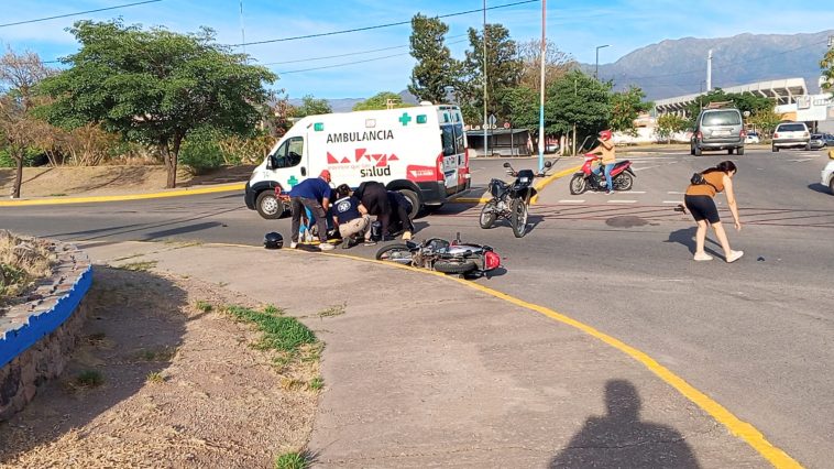 La moto terminó pegada al cordón de la rotonda. El golpe principal fue contra la puerta del conductor del auto.