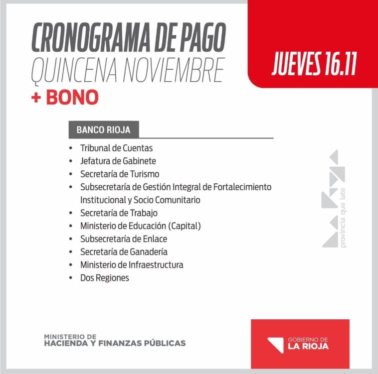 En un comunicado oficial, el Ministerio de Hacienda y Finanzas Públicas del Gobierno de La Rioja reveló el cronograma de pagos para la quincena de noviembre, con una noticia alentadora para algunos sectores de la Administración Pública Provincial.