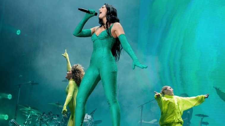 “Buenas noches, Buenos Aires. Aquí comienza la fiesta”, dijo en castellano una Dua Lipa enfundada en un ajustado traje verde, uno de los tantos vestuarios que utilizó.