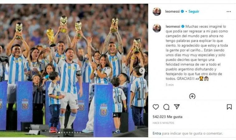 Lionel Messi, capitán de la Selección argentina, se mostró emocionado por lo vivido en la “fiesta del campeón”, en la que el elenco nacional venció a Panamá por 2 a 0 y celebró la obtención de la Copa del Mundo y utilizó las redes sociales para señalar que tiene “una felicidad inmensa” y que no tiene “palabras” para explicar lo que sintió, a la vez que agradeció el cariño del público que asistió en gran masa al renovado estadio Monumental.