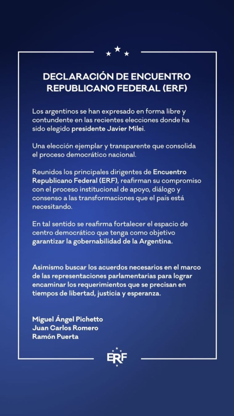 Después del resultado de las elecciones del pasado domingo donde Javier Milei fue elegido Presidente de la Nación, los principales dirigentes de Encuentro Republicano Federal publicaron una declaración sobre el resultado.