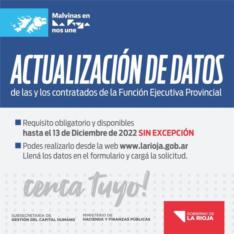 El subsecretario especificó que “en este caso estamos hablando exclusivamente de las personas que están contratadas en la Función Ejecutiva provincial, no importa la jurisdicción, mientras estén contratados, son los que tiene que hacer la actualización de datos”. “Esta actualización es simple, es un formulario web que se llena directamente en la página oficial del Gobierno de la provincia de La Rioja y es una cuestión importante de hacerlo, más allá de que esta gestión está enmarcada solamente en actualizar los datos” agregó.