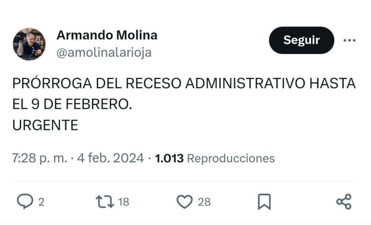 Ricardo Quintela, decidió prorrogar hasta el 9 de febrero el receso estival de las y los agentes de la administración pública. En tanto que el periodo de compensación de receso también se extendió desde el 12 de febrero al 29 de marzo, por lo que mañana, lunes, deberán presentarse a trabajar, e invitó a las demás funciones del Estado a adherirse al presente decreto cómo también, a los municipios.