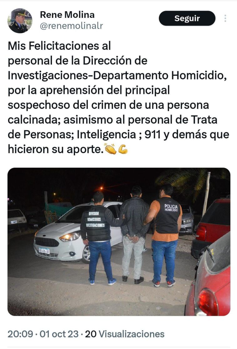 René manifestó “ Mis felicitaciones al personal de la dirección de investigaciones- Departamento de Homicidio, por la aprehensión del principal sospechoso del crimen de una persona calcinada; asímismo al personal de Trata de Persinas, Inteligencia, 911 y demás que hicieron su aporte”.