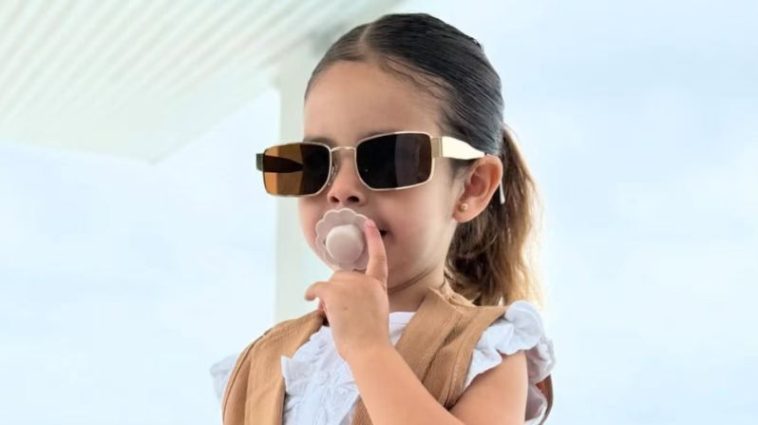 Sin embargo, lo que más enterneció a la audiencia fueron los accesorios: unos lentes de sol rectangulares de vidrio amarronado con marco dorado (que seguro le robó a su mamá) y un chupete en forma de flor haciendo juego.