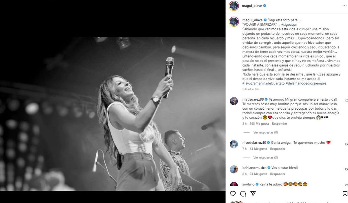 Tras recibir el alta, Magui Olave publicó un mensaje en sus redes sociales: “Elegí esta foto para …“VOLVER A EMPEZAR” … #sigoaqui Sabiendo que venimos a esta vida a cumplir una misión, dejando un pedacito de nosotros en cada momento, en cada persona, en cada recuerdo y más … Equivocándonos, pero sin olvidar de corregir, todo aquello que nos hizo saber que debíamos cambiar, para seguir creciendo y seguir buscando la manera de tener cada vez más cerca, nuestra mejor versión…