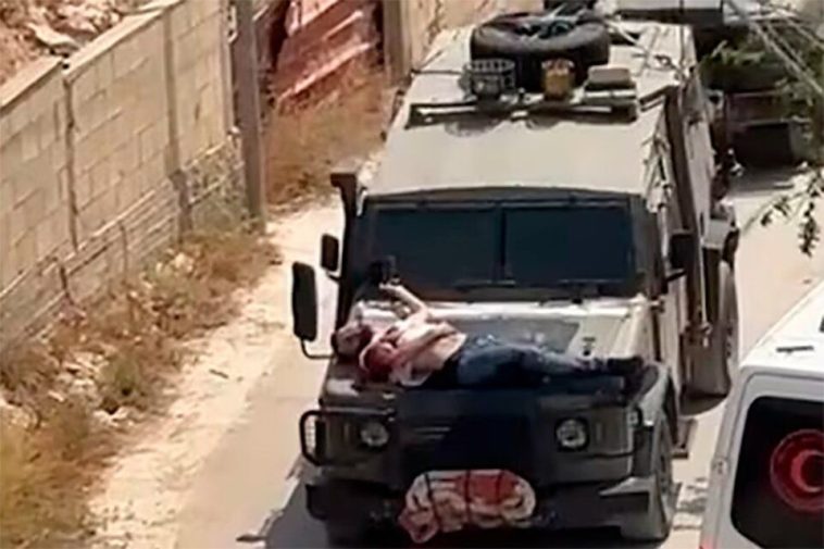 El sábado, las fuerzas del ejército israelí amarraron a un palestino herido al capó de un jeep militar durante una redada de detención en la ciudad ocupada de Yenín, en Cisjordania, informó el ejército israelí. El vídeo difundido en las redes sociales y verificado por la agencia de noticias Reuters mostraba a un palestino residente en Yenín, Mujahed Azmi, sobre un jeep militar que pasaba entre dos ambulancias.