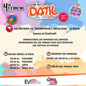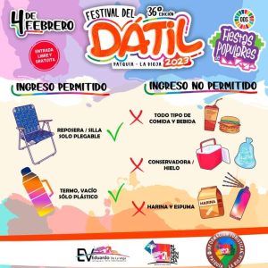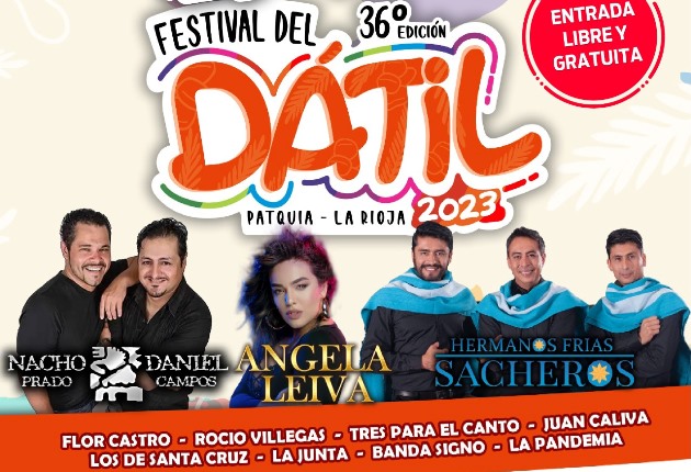 En el marco de las Fiestas Populares Riojanas, se realizará la 36° Edición del Festival Dátil, una vez más en el predio del polideportivo municipal de Patquia. Se trata de uno de los eventos más convocantes de la provincia y que está organizado por la Municipalidad del departamento Independencia con el aporte del Gobierno de la provincia.