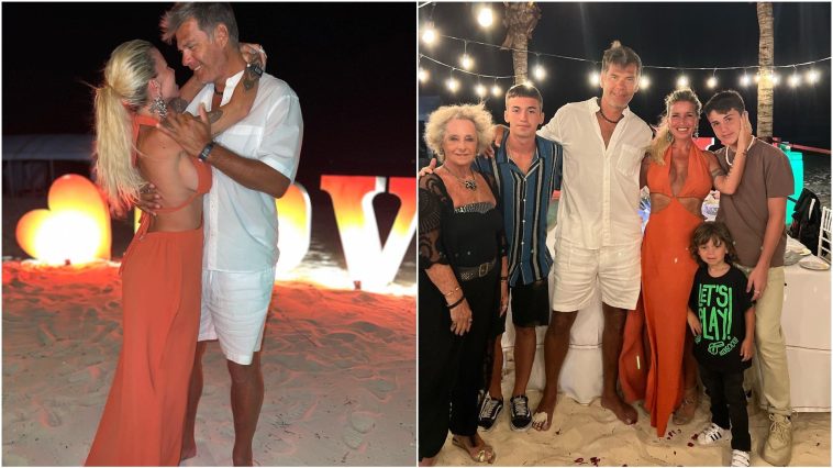 ¿El look de los novios? La conductora volvió a elegir a la diseñadora Camila Romano quien le hizo su primer vestido de novia, el que usó en Salta. Esta vez, el modelo fue pegado al cuerpo con corset y escote recto confeccionado en tul bordado con canutillos, paillete y cristales. ¿El detalle? Los breteles bordados. Llevó el pelo recogido, una cogotera de strass y aros colgantes.