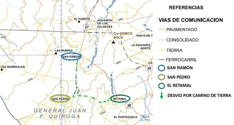 El Comité de Emergencias Provincial, a través de Vialidad de la Provincia, informó a quienes transiten por Ruta Provincial N° 27 desde Patquía (Departamento Independencia) hacia Portezuelo (Departamento Juan Facundo Quiroga) que al llegar a la intersección con Ruta Provincial N° 28, se deberá hacer un desvío de 30 kilómetros por un tramo de tierra en el paraje San Pedro.