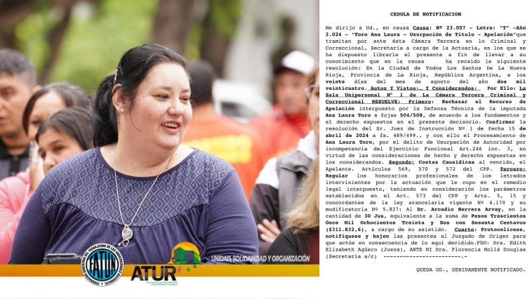 La Cámara Tercera en lo Criminal y Correccional de La Rioja ha confirmado el procesamiento de Ana Laura Toro por el delito de usurpación de autoridad e incompetencia del ejercicio funcional. La decisión, emitida el 20 de agosto de 2024, rechaza el recurso de apelación presentado por la defensa de Toro y ratifica la resolución inicial del juez de instrucción.