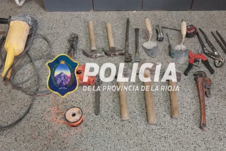 Una vez en el lugar el individuo se torna agresivo intentando darse a la fuga. Ante tal situación es trasladado a base de dependencia. Mediante tareas investigativas por el personal de sumario, se logra establecer que en el domicilio de la moradora de apellido Farias (37) se habría encontrado diversos elementos mal habidos; (01) Amoladora, (02) llaves de fuerza, (01) Tarraja de color rojo,(03) masa cabo de madera, (02) martillos cabo de madera, (01) rollo de tanza de 100 metros, (01) llave francesa, (01) grinfa, (01) corta fierro, (02) cucharas de albañil, (01) cutter, (01) destornillador Punta plana, (01) llave pico loro, (01) tenaza, (01) cinta métrica, (01) tijera pinza corta caño.