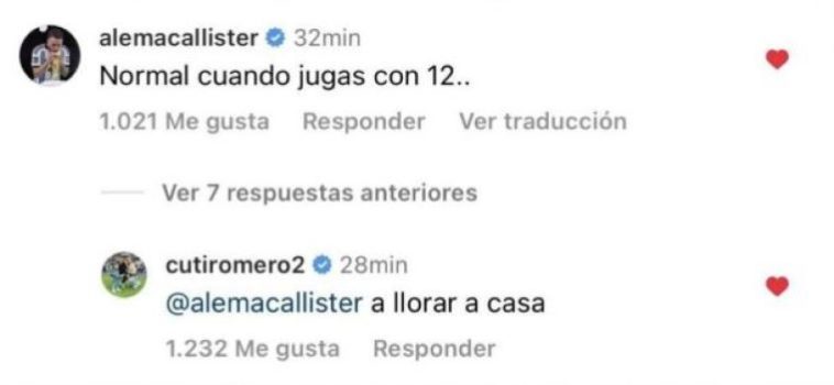 Una vez culminado el partido, ‘Cuti’ Romero subió una publicación a modo de celebración por la victoria de los ‘Spurs’ y, ni lento ni perezoso, Mac Allister aprovechó la ocasión para escribirle al zaguero central surgido de Belgrano de Córdoba: “Normal cuando jugas con 12…”.