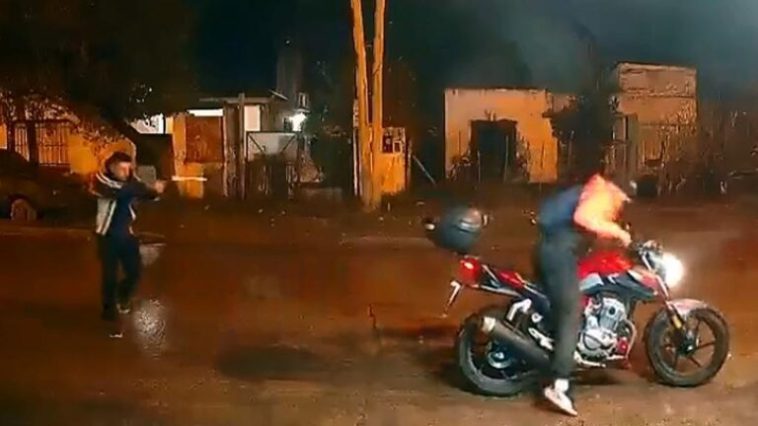Mientras avanzaban por la calle, quien iba de acompañante en la moto azul se acercó a los tripulantes de la moto como si les apuntara con un arma de fuego -lo cual no se aprecia con nitidez en el video-, por lo que, a los pocos metros, el policía detuvo la marcha. En esas circunstancias, el delincuente descendió de la moto azul y se acercó hasta la pareja, que también abandonó su rodado.