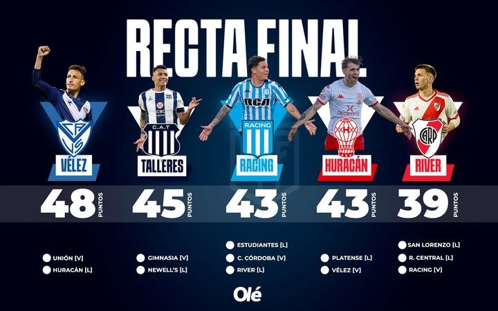 En un último lote de candidatos, pero con muy pocas chances, están Huracán y River. El primero de ellos está a cinco unidades de Vélez, mientras que el otro está a nueve, por lo que debe ganar los tres que le faltan y esperar que el líder no sume puntos.