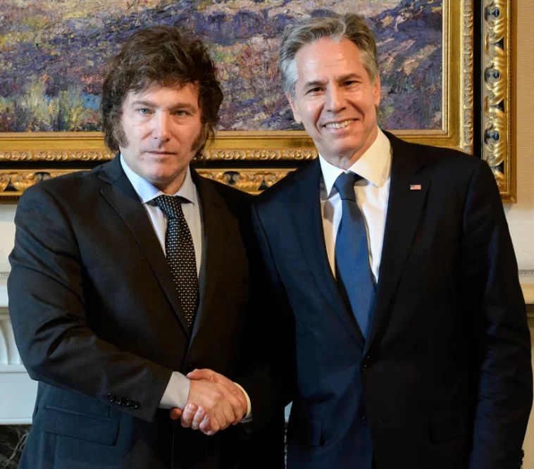Tras la reunión que mantuvieron, el presidente Javier Milei y el secretario de Estado de Estados Unidos, Antony Blinken, salieron al mítico balcón de la Casa Rosada para saludar a la gente que se encontraba en la Plaza de Mayo.