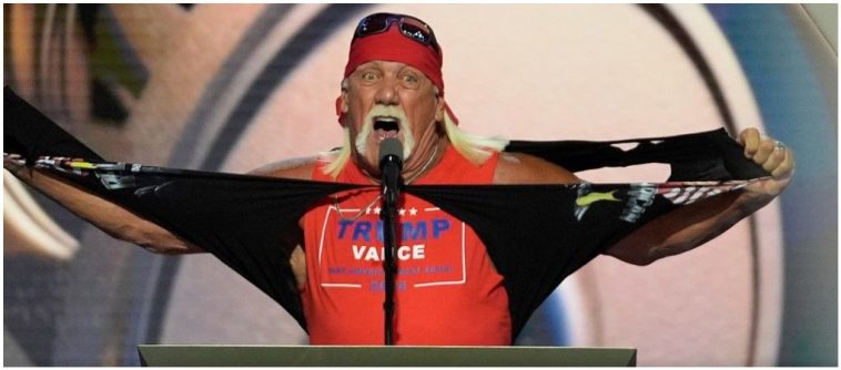 En julio de 2024, Hogan se presentó en la Convención Nacional Republicana y rasgó sus vestiduras para revelar una musculosa roja con la leyenda “Trump-Vance”.