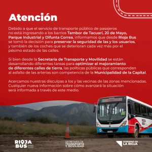 Los colectivos de Rioja Bus no se encuentran ingresando a los barrio Tambor de Tacuarí, 20 de Mayo, Parque Industrial y Difunta Correa debido al mal estado de las calles. Desde la empresa se disculparon con los usuarios y pidieron a las autoridades municipales tomar cartas en el asunto.