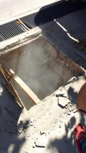 Una camioneta se disponía a cruzar Lamadrid, por Pelagio B. Luna, cuando una madera que cubría un gran orificio en el asfalto cedió, la rueda trasera del rodado quedó atascada en el importante agujero.