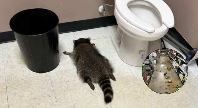 Cuando Samantha llegó al negocio, encontró el desastre: botellas rotas, alcohol derramado y al mapache tirado junto al inodoro después de su particular borrachera.